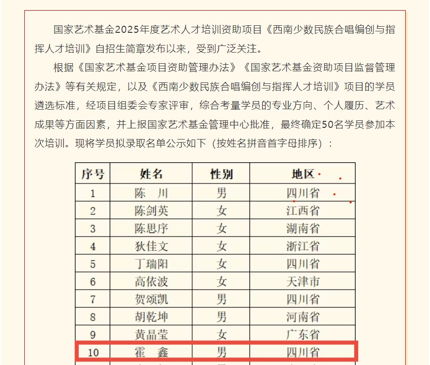 7月4日,人文学院(国际教育中心)美育教研室教师霍鑫凭借扎实的专业功底与丰富的艺术成果脱颖而出,成功入选国家艺术基金2025年度艺术人才培训资助项目《西南少数民族合唱编创与指挥人才培训》学员拟录取名单。